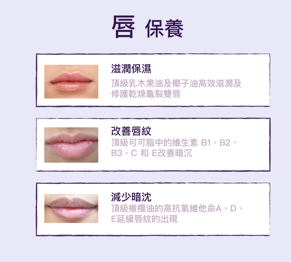 用途:消化唇紋、修護乾燥、滋潤保濕、改善唇色