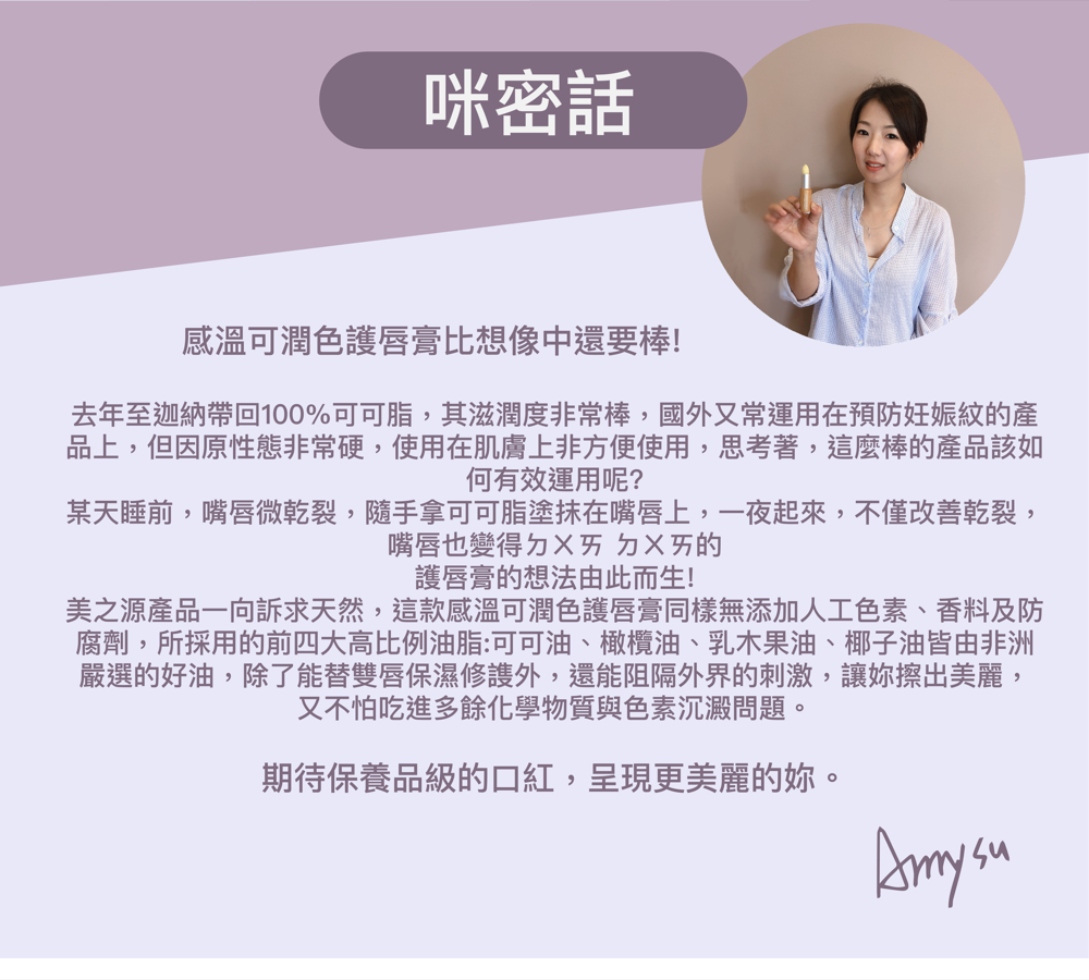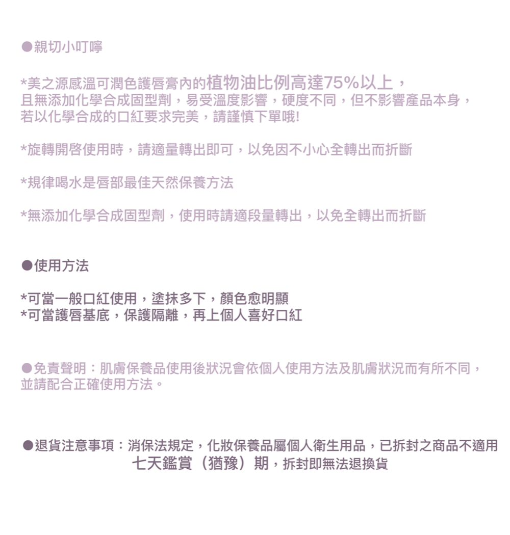 *親切小叮嚀 *美之源感溫可潤色護唇膏內的植物油比例高達75%以上,且無添加化學合成固型劑,易受溫度影響,硬度不同,不影響產品品質。