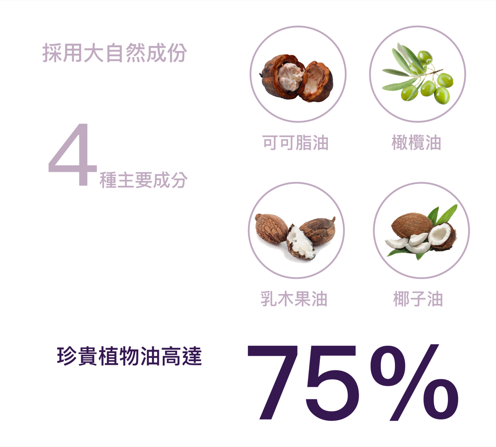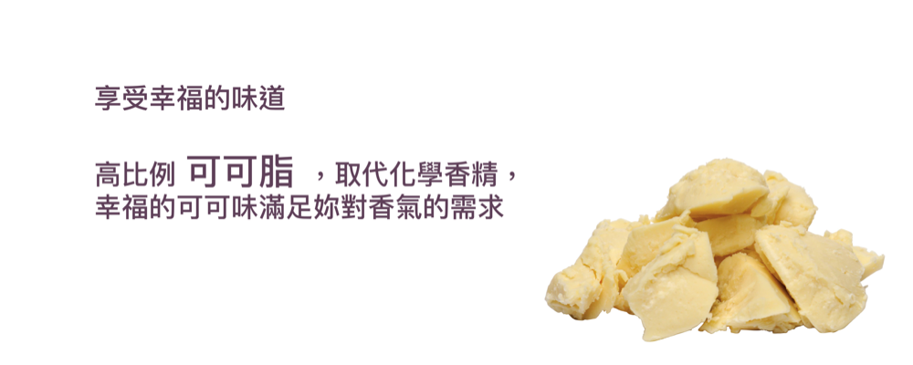 成份:高比例可可油,橄欖油,椰子油,乳木果油 Cocoa Butter, Unrefined Olive Oil, Unrefined Shea Butter, Coconut Oil, Sweet Almond oil, Rose Hip Oil, D&C Red27, Palmitoyl Hexapeptide-6, Beeswax