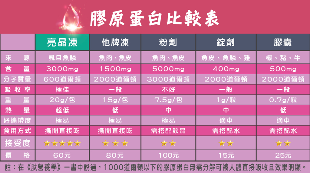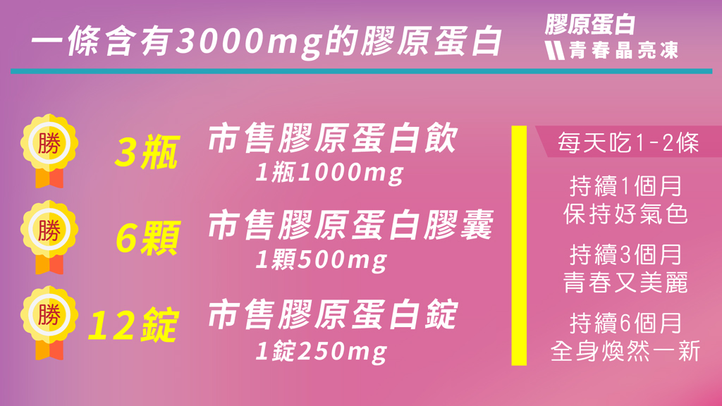 一條含有3000mg的膠原蛋白,勝過3瓶市售膠原蛋白飲(1瓶1000mg)、6顆市售膠原蛋白膠囊(1顆500mg)、12錠市售膠原蛋白錠(1錠250mg)。