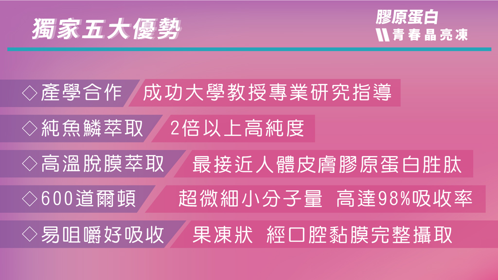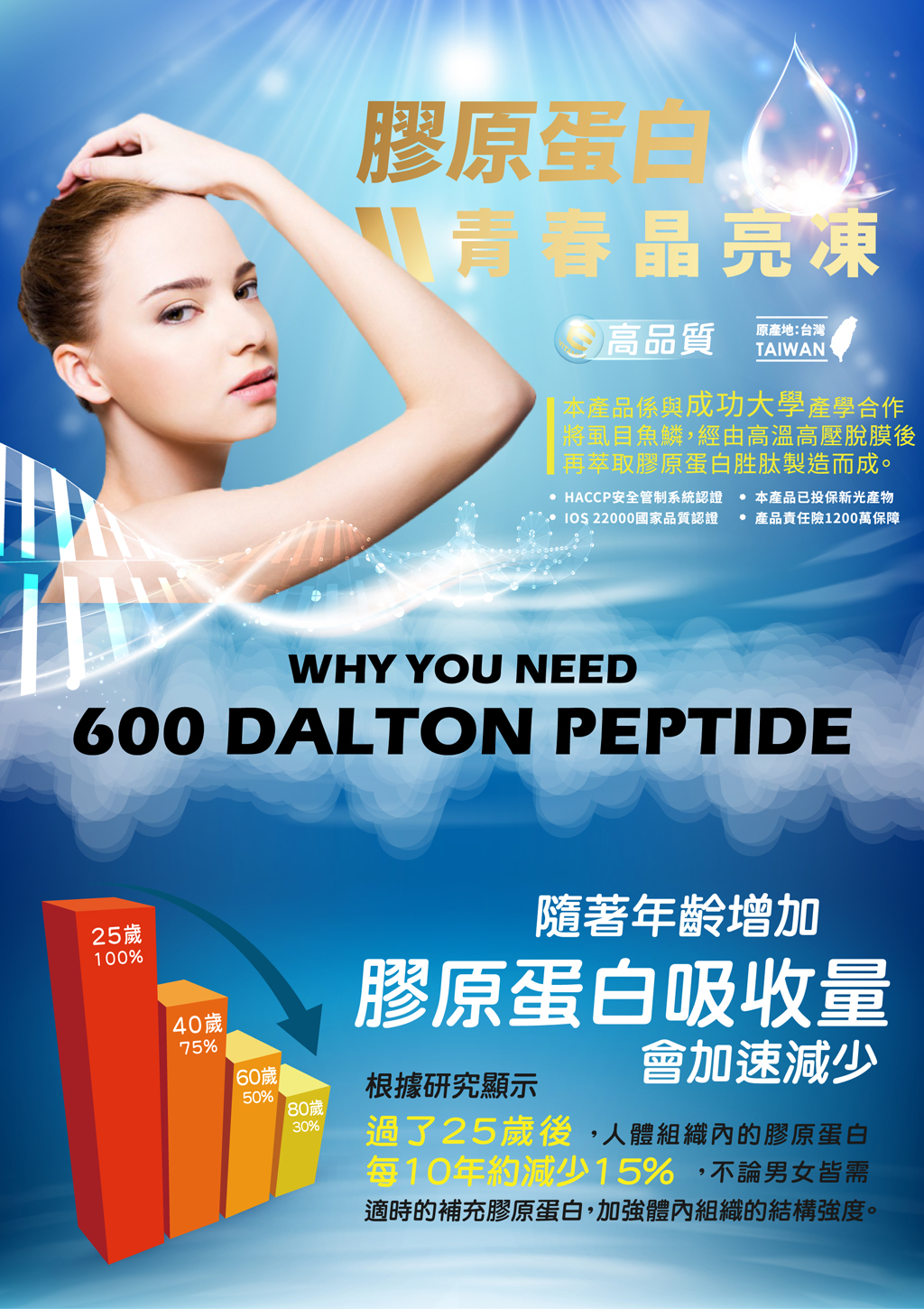 本產品係與成功大學產學合作,將虱目魚鱗,經由高溫高壓脫膜後,再萃取膠原蛋白胜肽製造而成。