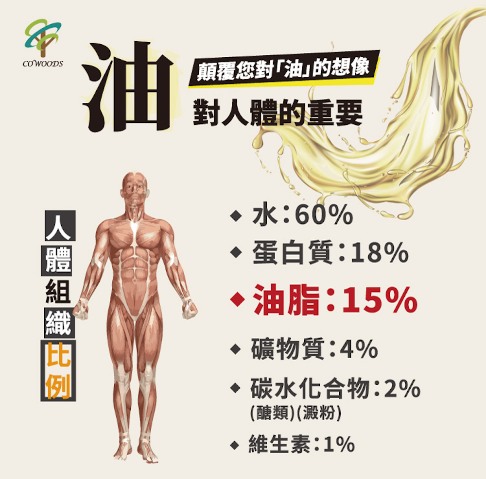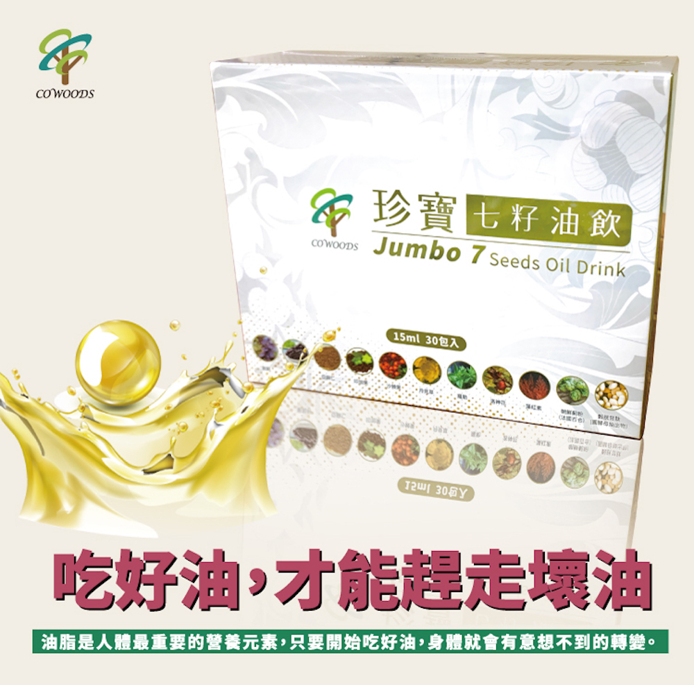 人體組織比例中,油脂佔了15%,是人體最重要的營養元素之一,只要開始吃好油,才能趕走壞油,身體就會有意想不到的轉變;珍寶七籽油飲一包補充7種植物油(含有完整脂肪酸Omega3、6、7、9)及4種元氣精華。