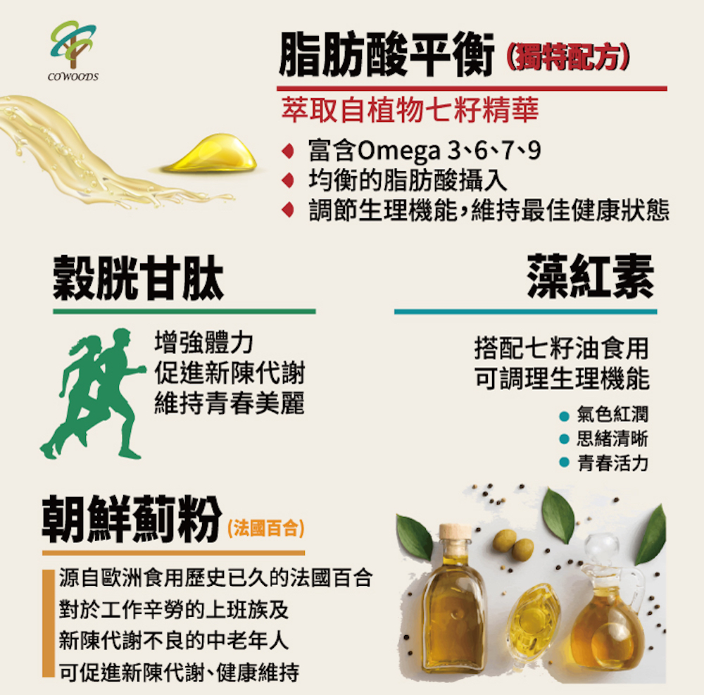 藻紅素:搭配七籽油食用,可調理生理機能,氣色紅潤、思緒清晰、青春活力。