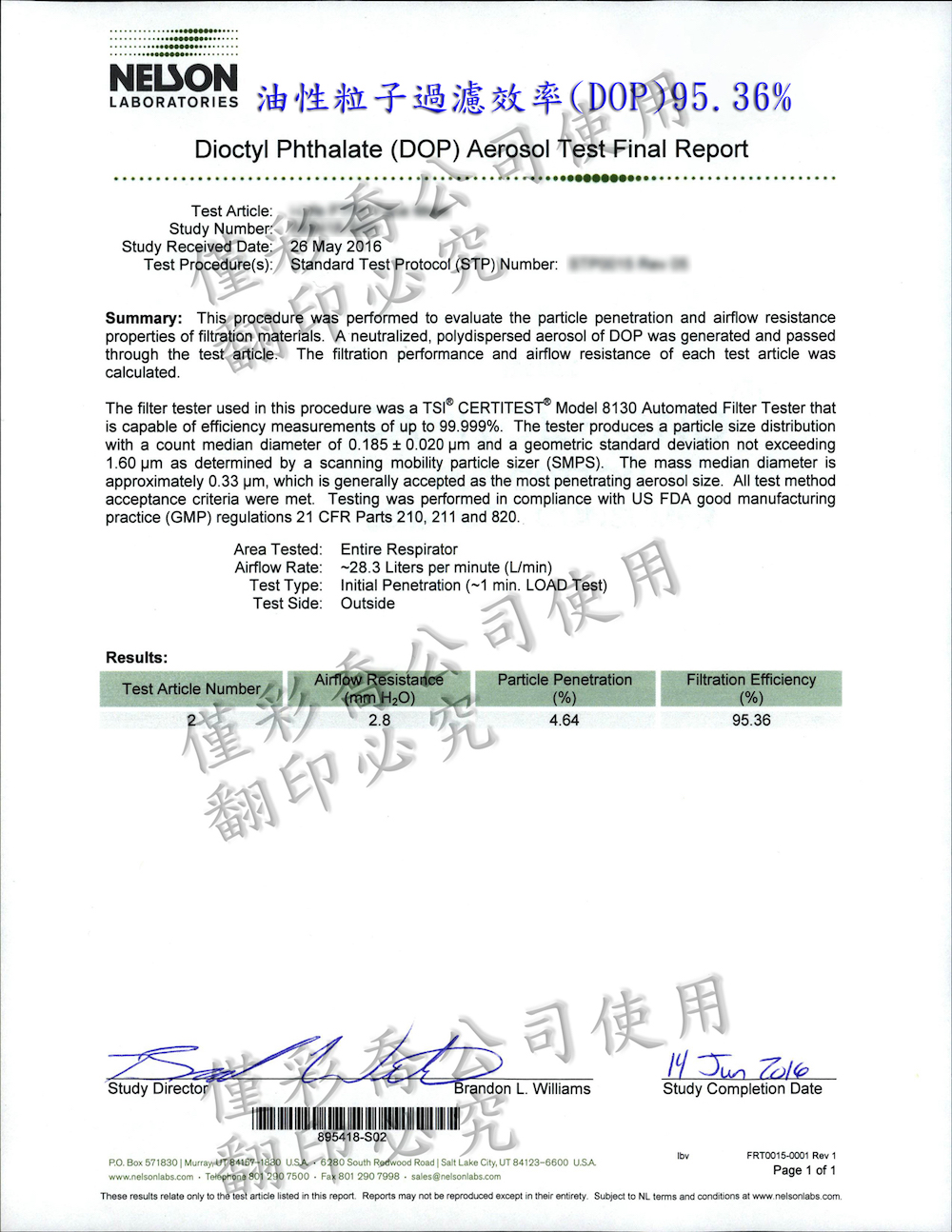 -通過美國Nelson Laboratories高抗油特性對油性粒子DOP過濾效率達95.36%
