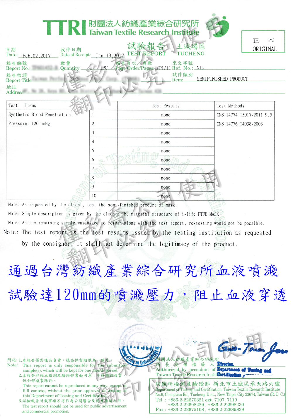 -通過台灣紡織產業綜合研究所血液噴濺試驗達120mm的噴灑壓力,阻止血液穿透