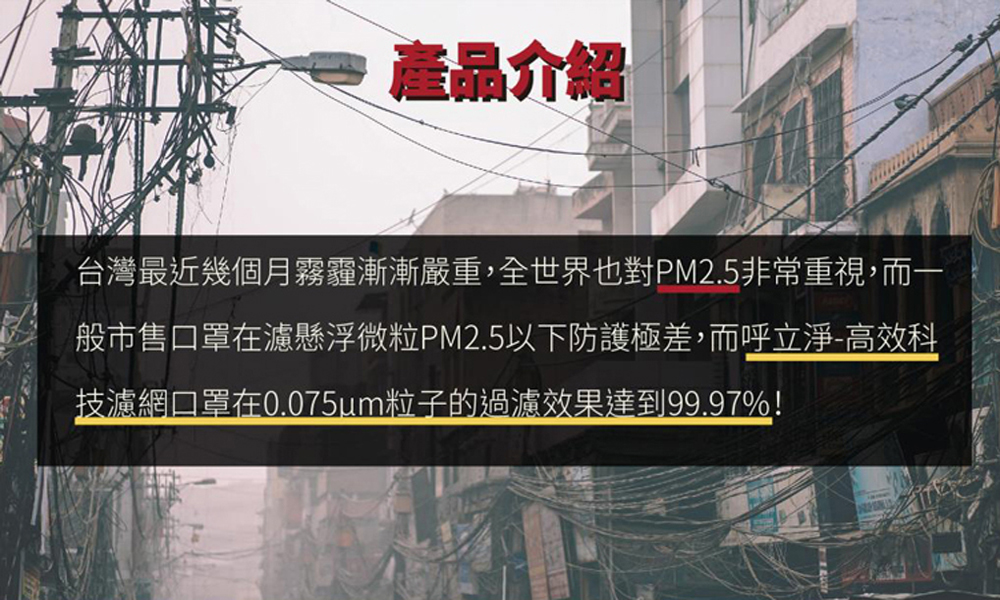 台灣霧霾嚴重,全世界也對PM2.5非常重視,而一般市售口罩在濾懸浮微粒PM2.5以下防護極差,而呼立淨-高效科技濾網口罩在0.075µm粒子的過濾效果達到99.97%,比市售N95口罩更棒!